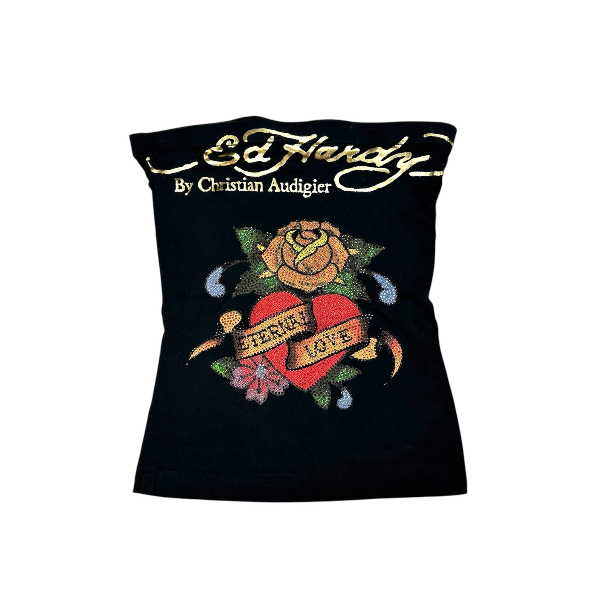 Insane Ed Hardy Y2K graphic tube top featuring the logo in gold and an eternal love heart and rose with rhinestones