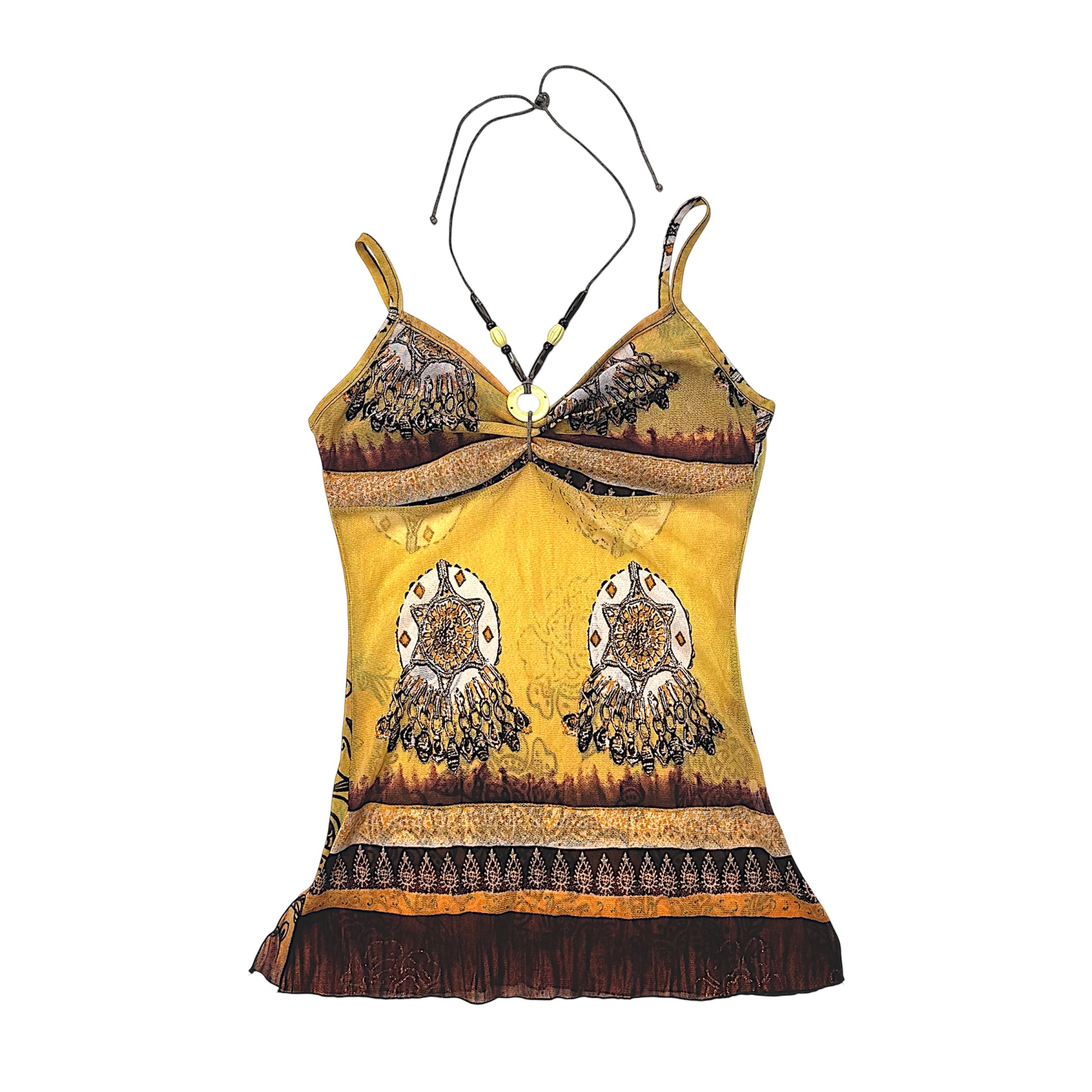 Gorgeous mesh cami with a tribal, almost spiritual style print and gold shimmer throughout